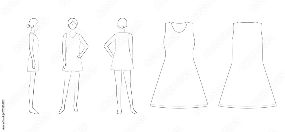 Tableau sur toile アパレルデザイン用テンプレートのベクター画像:女性用テニスウェアのワンピース / Vector image of apparel design template