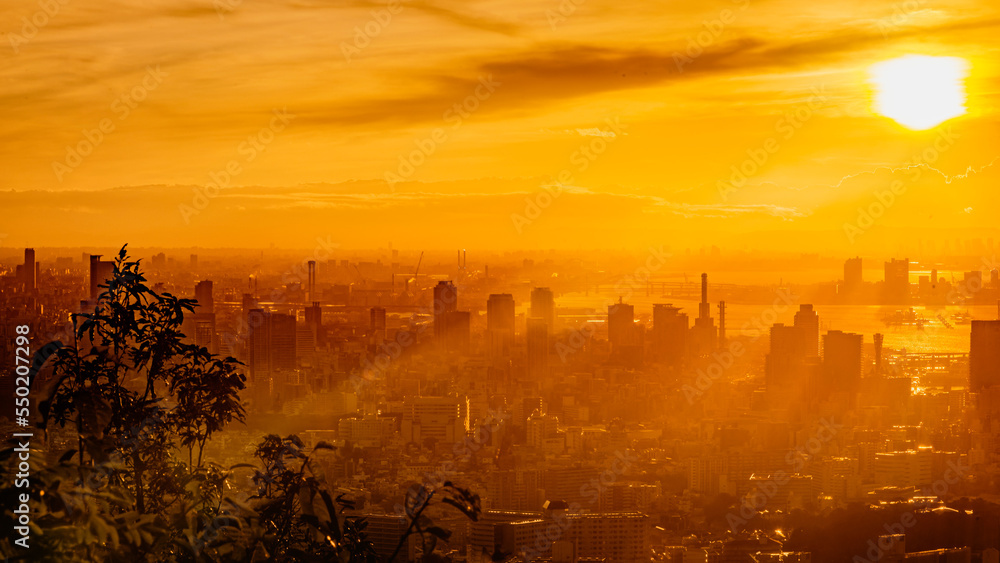 Tableau sur toile 兵庫県・ドラマチックな朝の大阪湾、神戸港の朝霞風景2019年