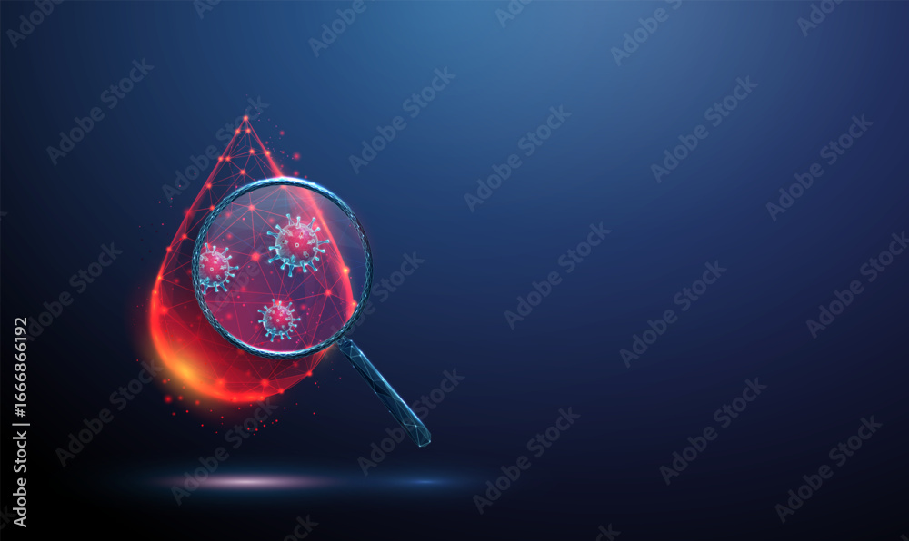 Photos 3 d drop of blood under a magnifying glass with red viruses inside