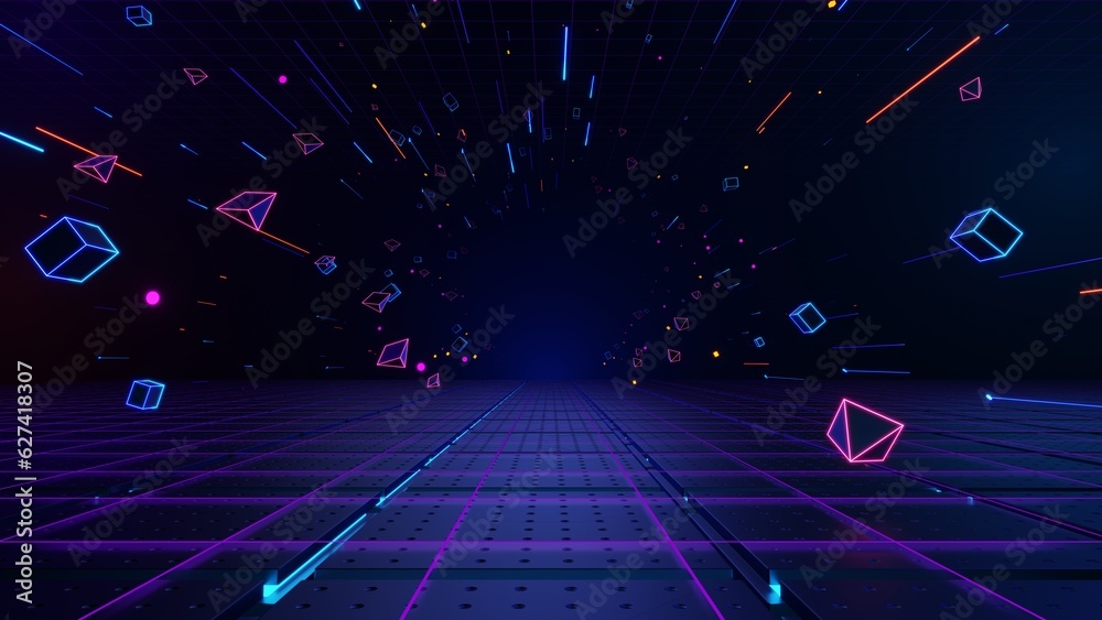 Tableau sur toile 3d technology abstract neon light background, empty space scene, spotlight, dark night, virtual reality, cyber futuristic sci-fi background, street floor studio for mock up