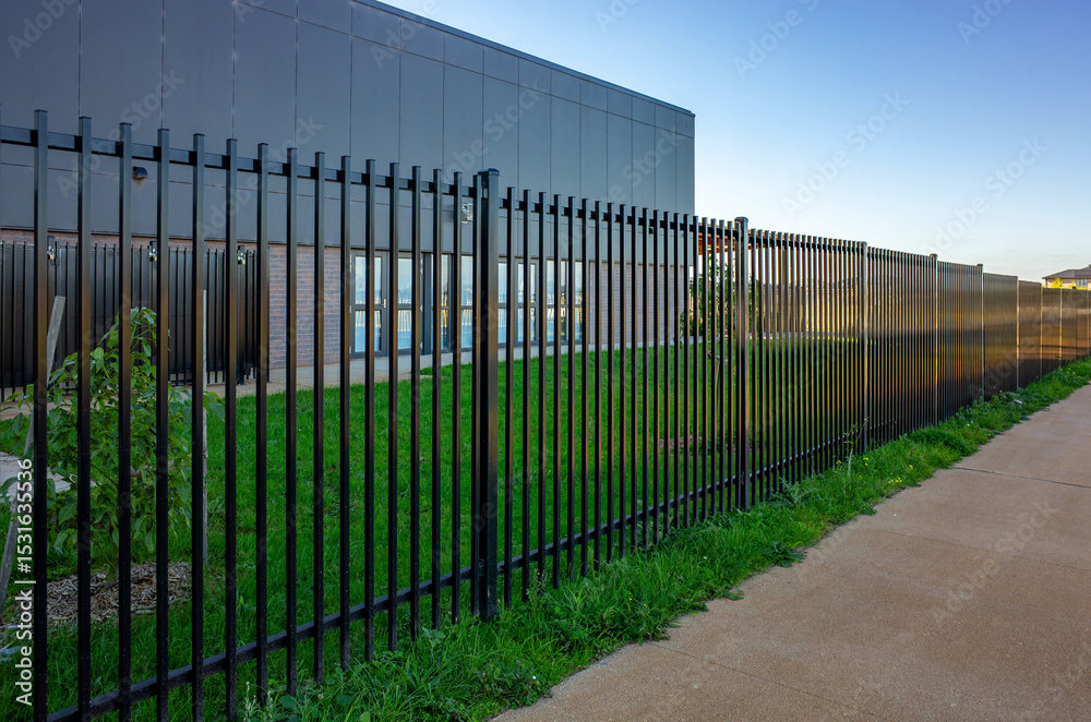 Photos A black vertical metal security fence lines a path in front of a contemporary institutional or school building