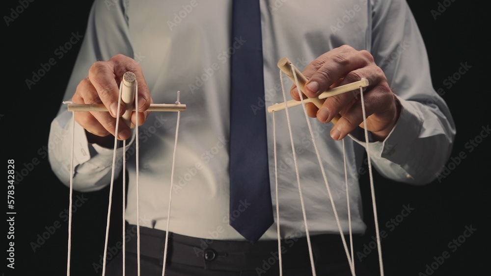Tableau sur toile A businessman in a gray shirt and black tie controls a puppet with a wooden manipulator and strings