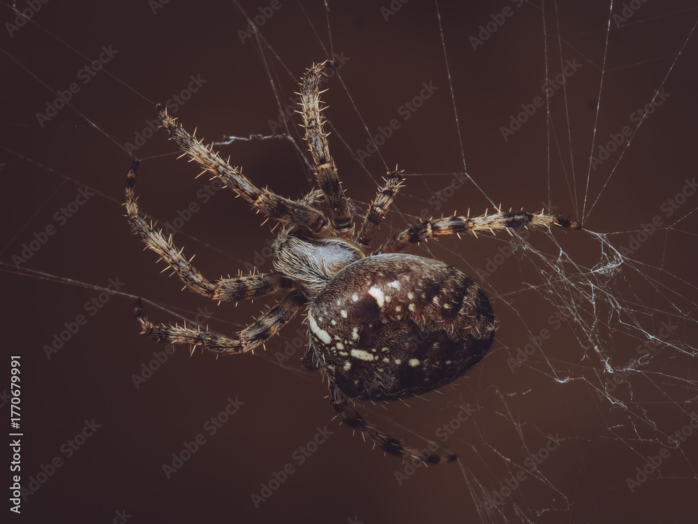 Photos A close-up of a Garden Cross Spider on it's web, waiting for prey