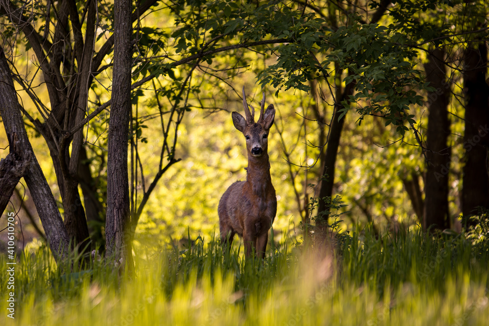 Tableau sur toile a deer in the forest looking at the camera in spring season
