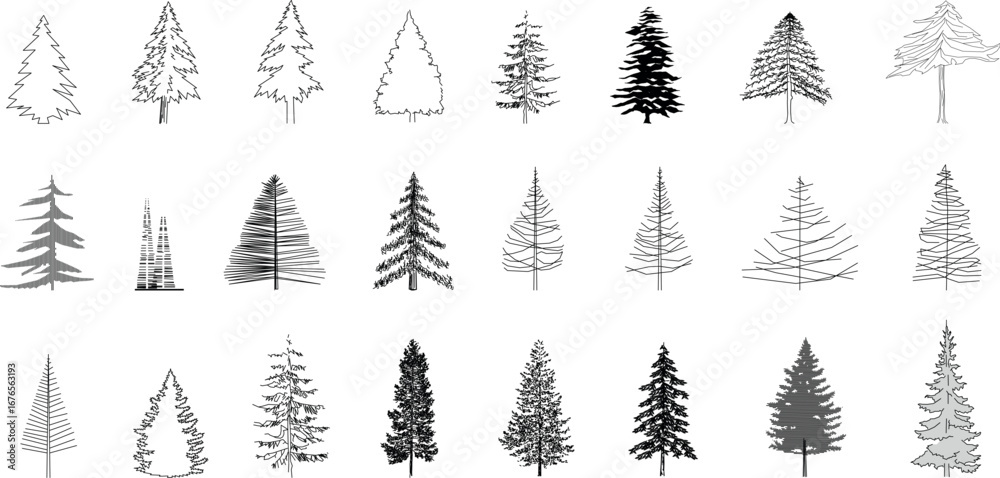 Photos A detailed black-and-white vector collection of various conifer tree elevations, suitable for architectural, landscape, and urban design projects that require a natural and detailed aesthetic