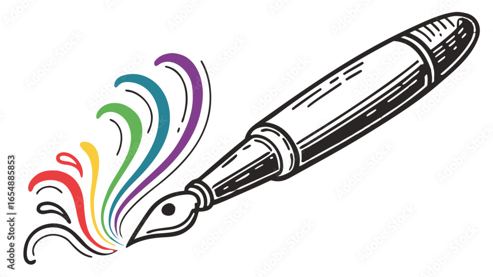 Photos A drawing of a fountain pen with colorful ink emanating from the nib in a swirli