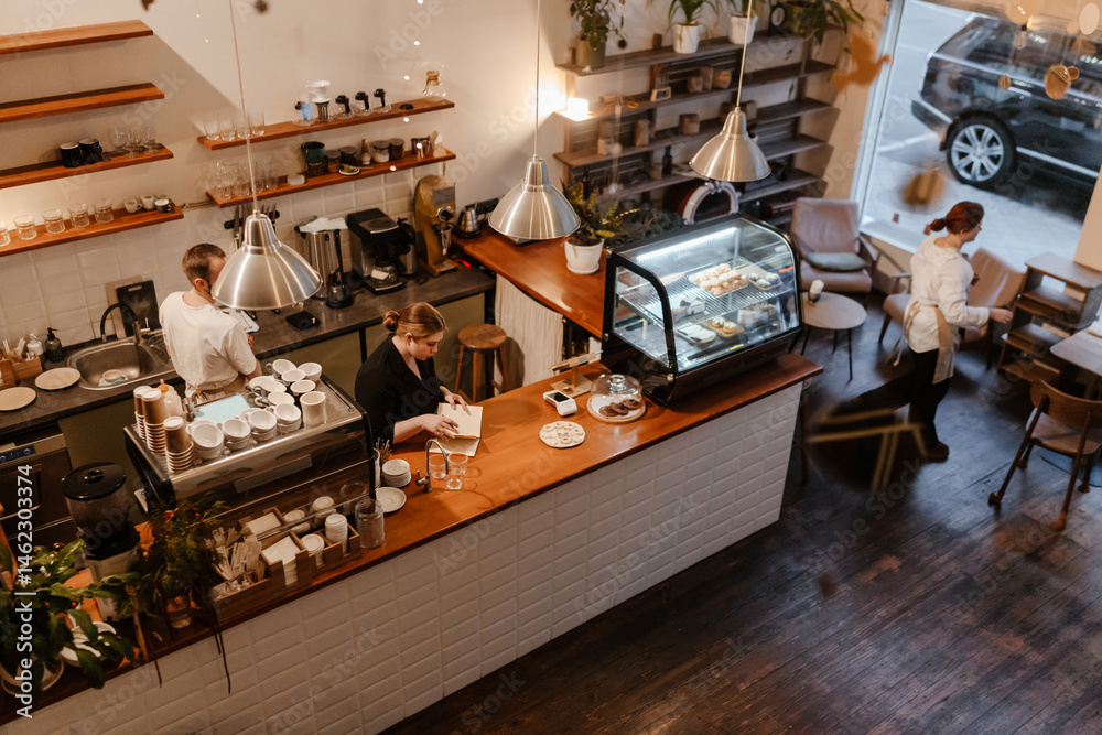 Photos A group of white adults, including baristas and waitstaff, prepare coffee and serve tables at a cozy cafe with wooden floors and a pastry display counter