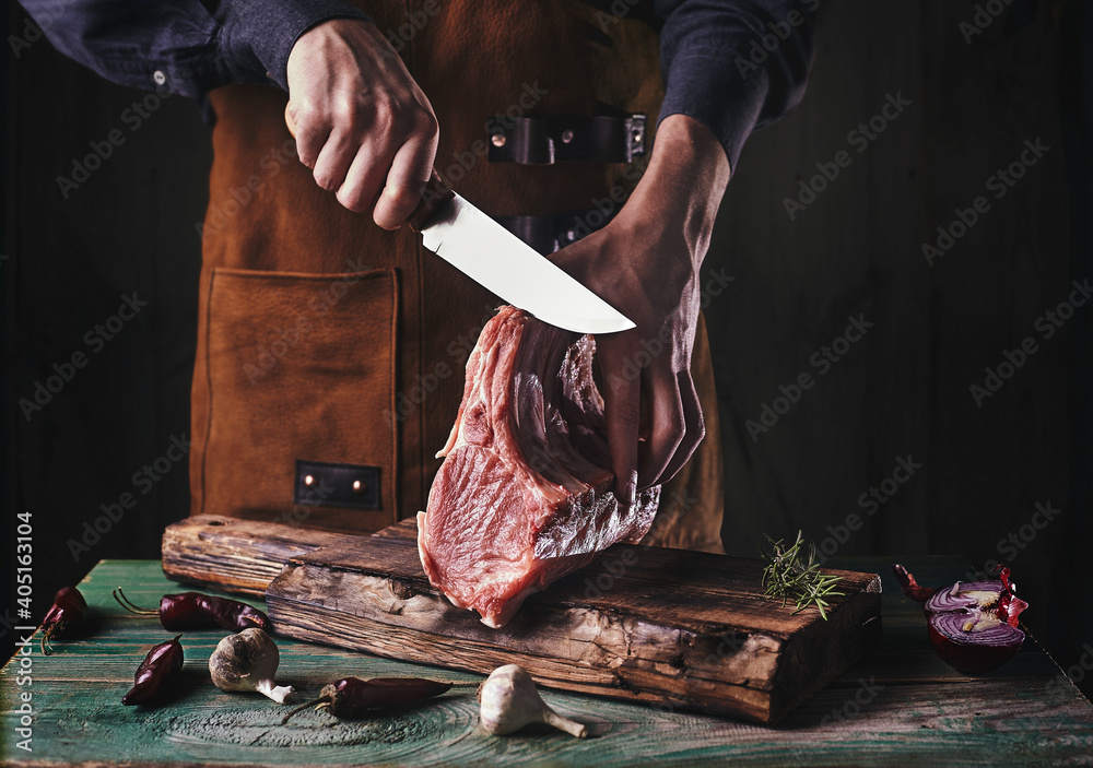 A guy in a leather apron is slicing raw meat. The butcher cuts the pork ribs. Meat with bone on a wooden cutting board..