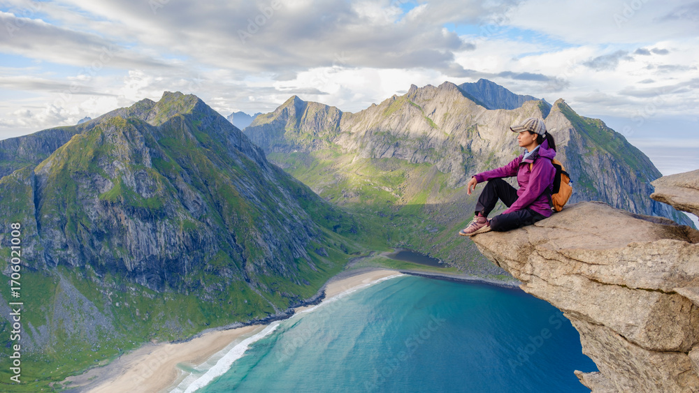 Photos A hiker rests at the edge of a rocky cliff on Ryten, admiring the stunning panorama of Kvalvika Beach and the rugged Lofoten landscape during a clear day
