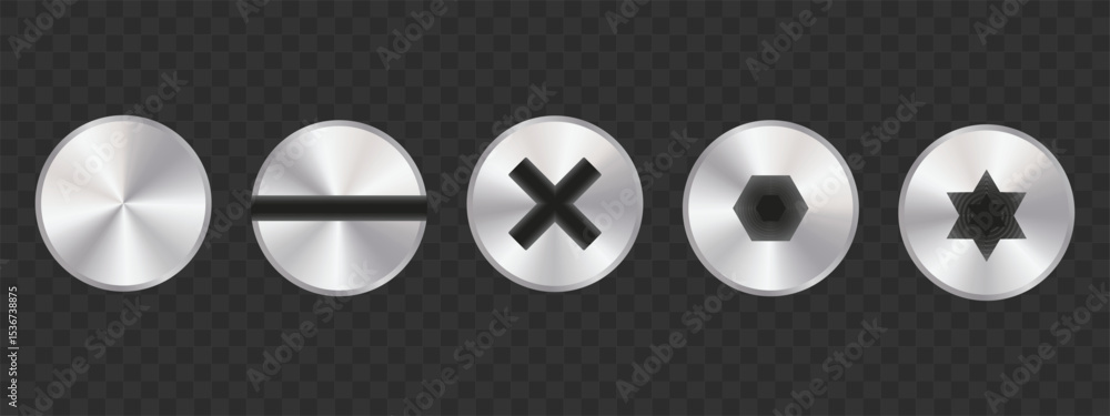 Photos A lineup of screw head types shown in detail, including slotted, Phillips, hexagon, and star drive varieties, set against a translucent dark background