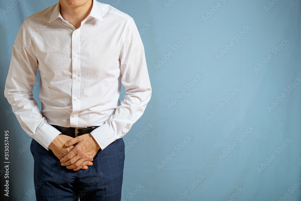 Tableau sur toile A man in trousers and a white shirt holds on to his groin, a symbol of testicula