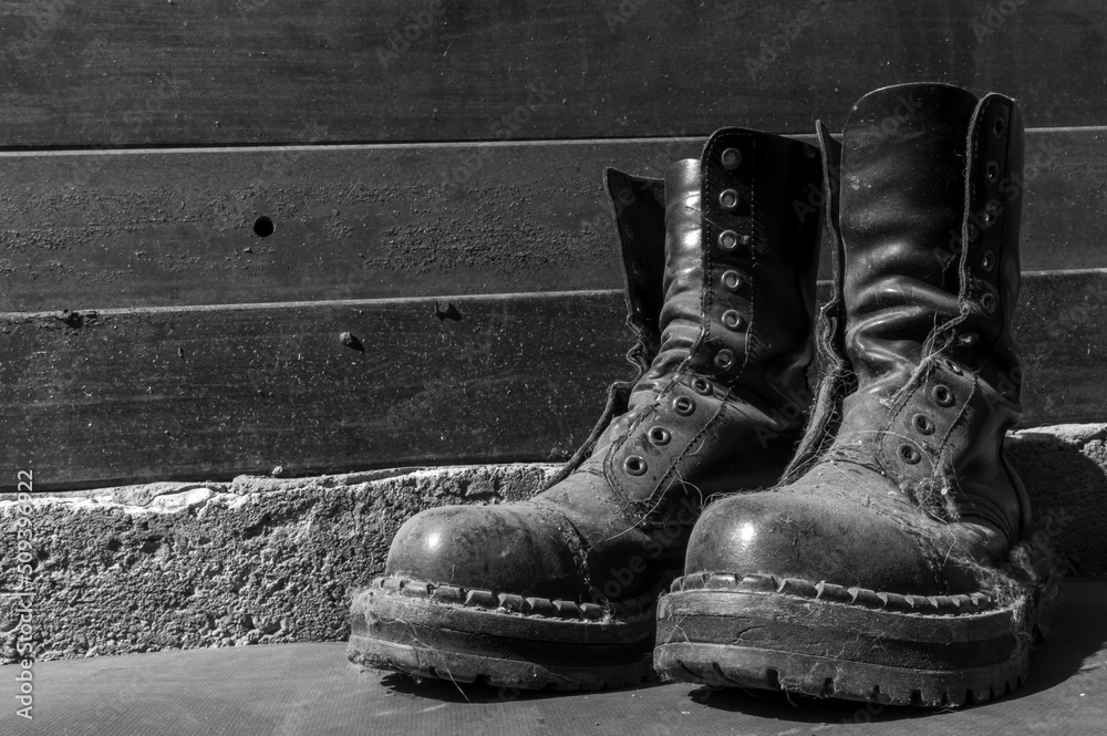 Tableau sur toile a pair of old dusty leather punk boots without laces