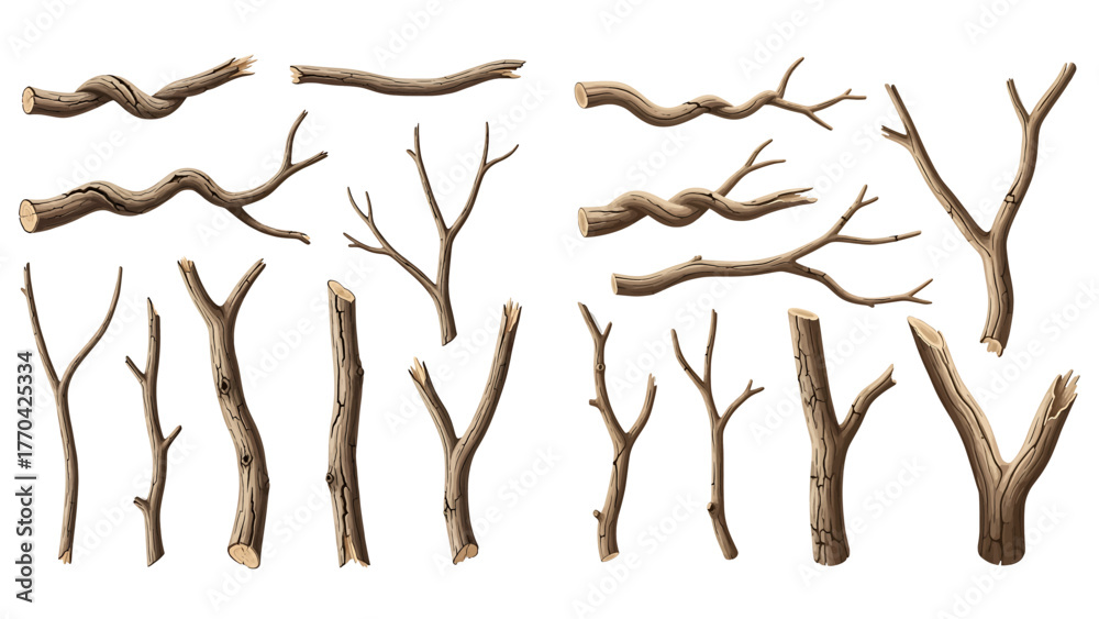 Photos A realistic collection of various dry, bare, and twisted tree branches and sticks isolated on a transparent background