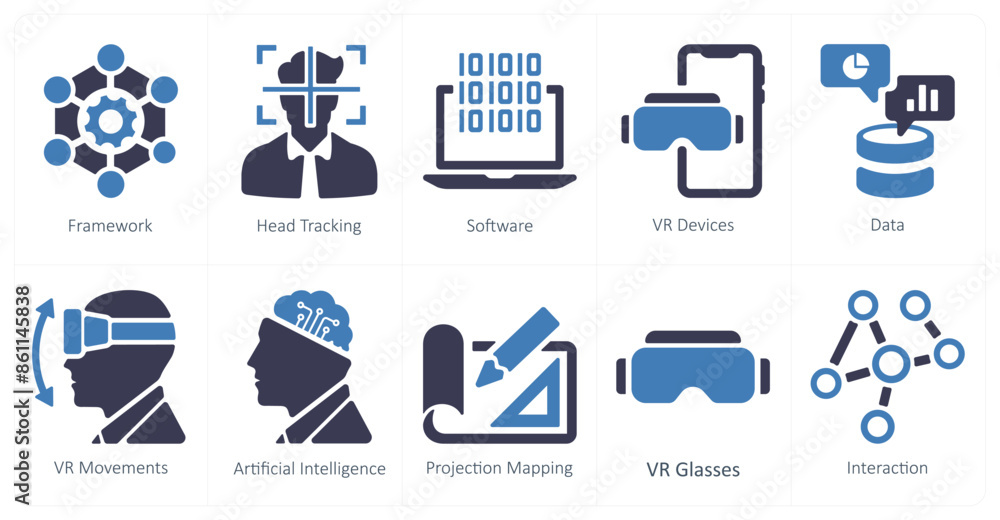 Tableau sur toile A set of 10 Virtual Reality icons as framework, head tracking, software