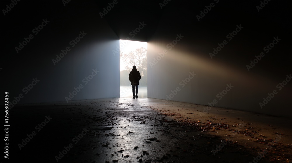 Photos A silhouette walking from dark to light, symbolizing healing, hope, and recovery from depression and emotional struggle