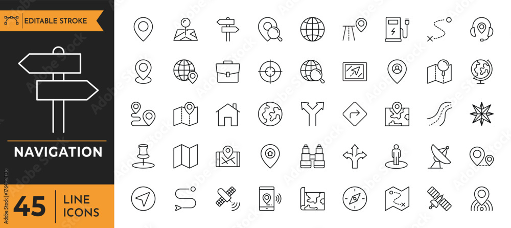 Tableau sur toile A sleek set of navigation icons in minimalist line style with editable strokes, designed for seamless integration into maps, mobile apps, dashboards, and location-based interfaces