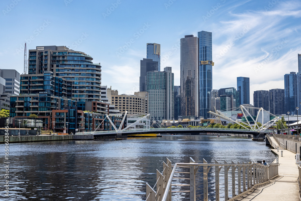 Photos A view of the Yarra River and city architecture of Melbourne, Australia, with the Seafarers Bridge in the distance