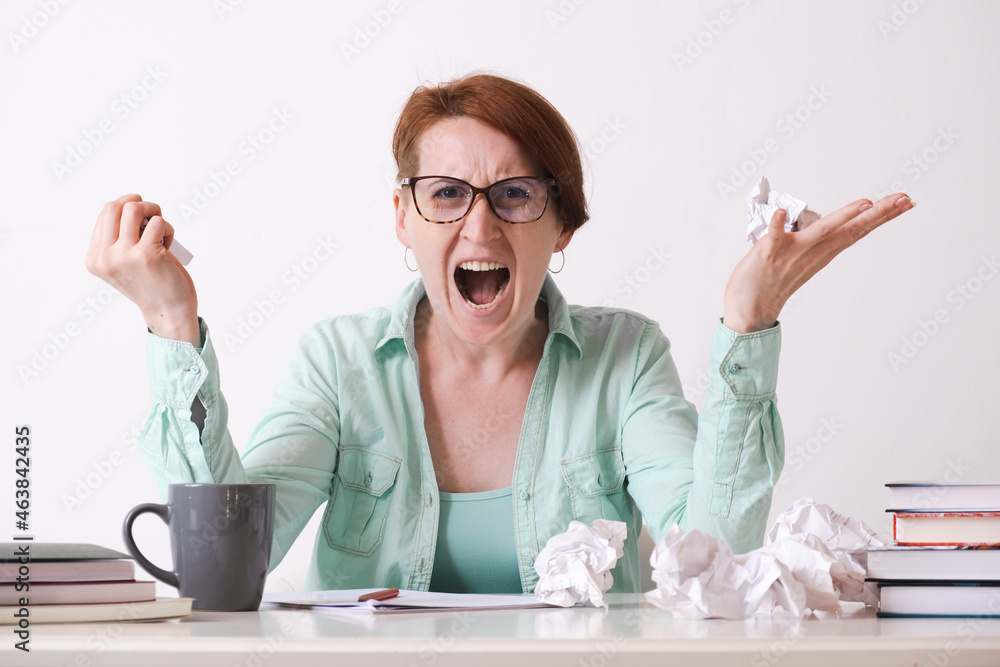 Tableau sur toile A young woman with glasses in a rage crudged the paper sheets