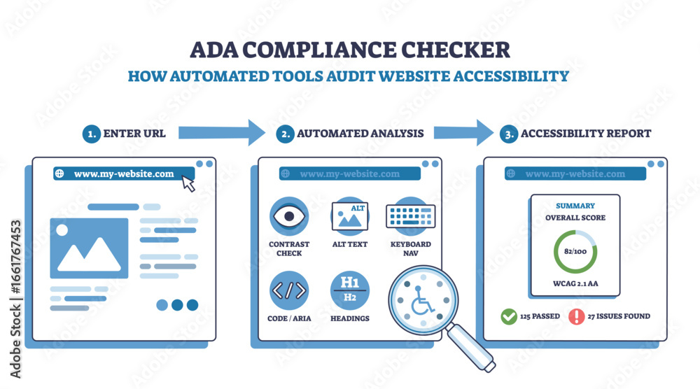 Photos ADA compliance checker process shows website input, automated accessibility analysis, and report summary