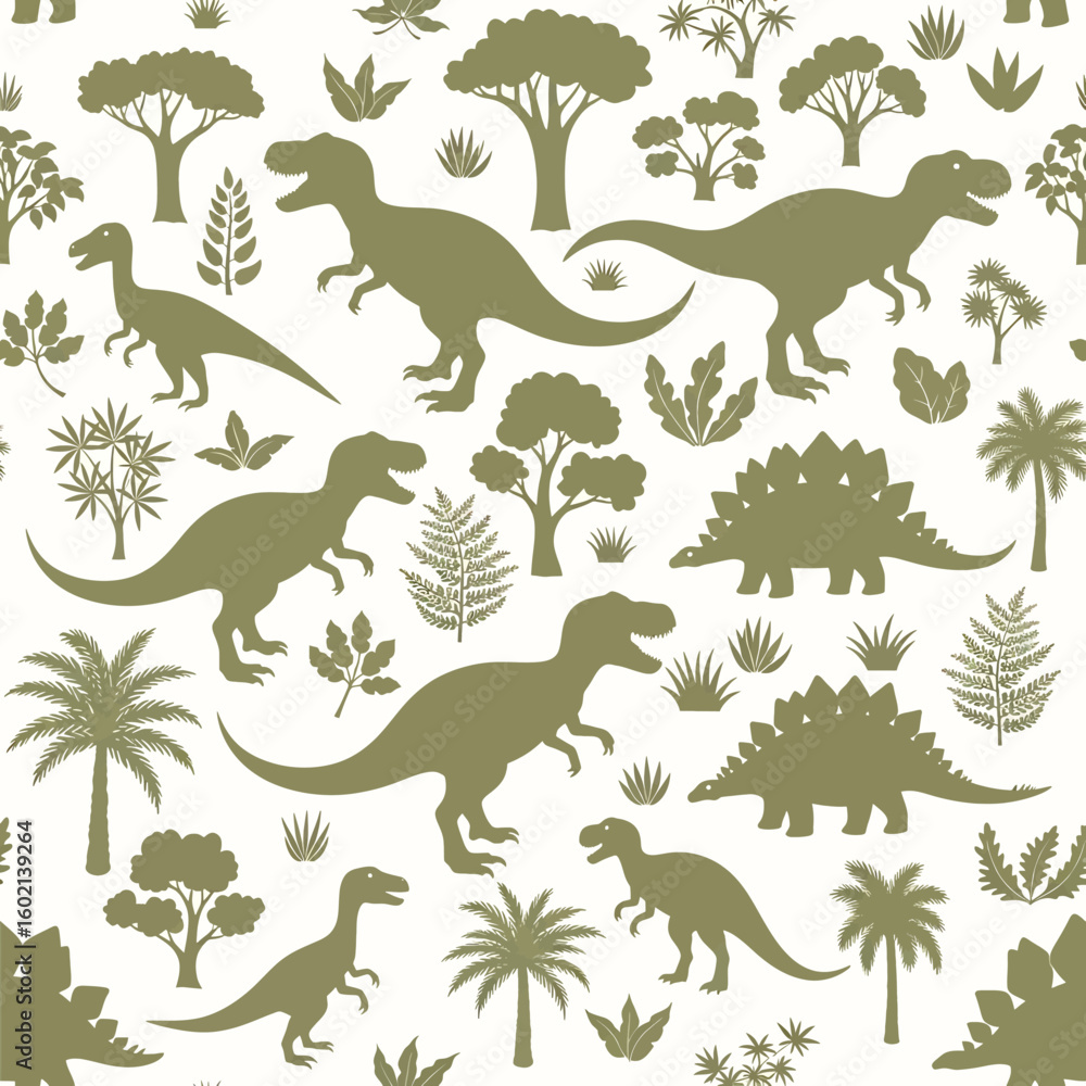 Tableau sur toile Adobe Illustrator artwork seamless pattern of dinosaur silhouettes including T-Rex, Stegosaurus, and Pterodactyl, with prehistoric trees and plants