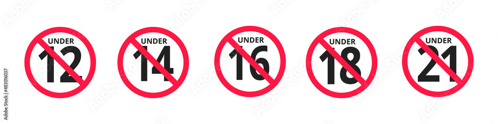 Photos Adults content only age restriction 12, 14, 16, 18, 21 plus years old icon signs set flat style design vector illustration
