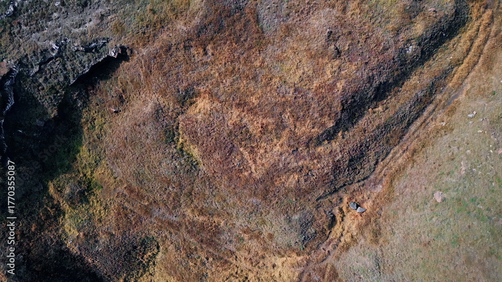 Tableau sur toile Aerial dry rocky ground with sparse vegetation and scattered stones