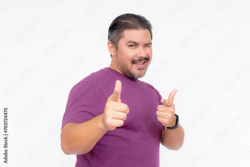 Photos An overweight middle aged man winking while making the finger gun gesture