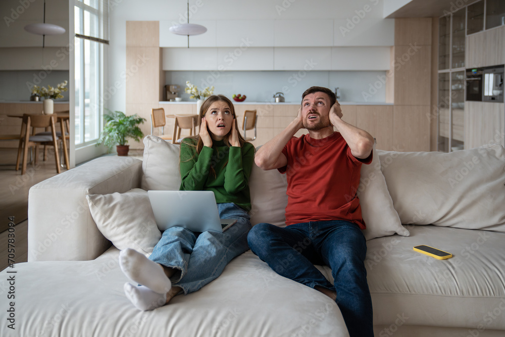 Photos Annoyed unhappy couple sitting on sofa with vexed face expression, looking upward, closing ears because of loud sound, noise from neighboring flat