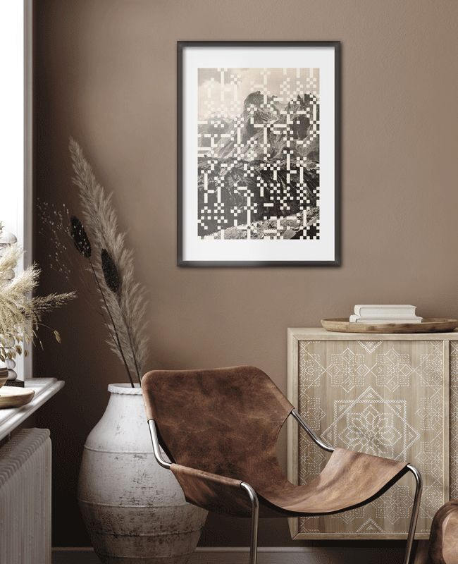 Cadre de haute qualité fabriqué en Europe, avec du plexiglas et des panneaux MDF. Au dos, il contient des poignées en acier des deux côtés pour faciliter l'accrochage. Ne contient pas de passe-partout.