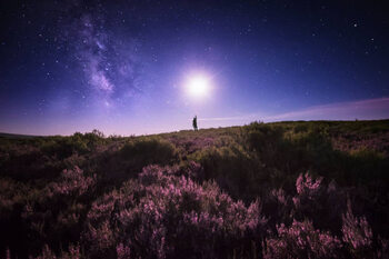 A purple flower field at night with moon and milky way and a person looking to the skies