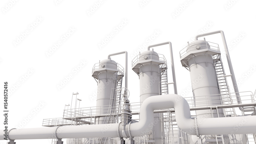Poster adhésif Detailed white scale model of a petrochemical plant, rendered in a single-tone monochrome palette