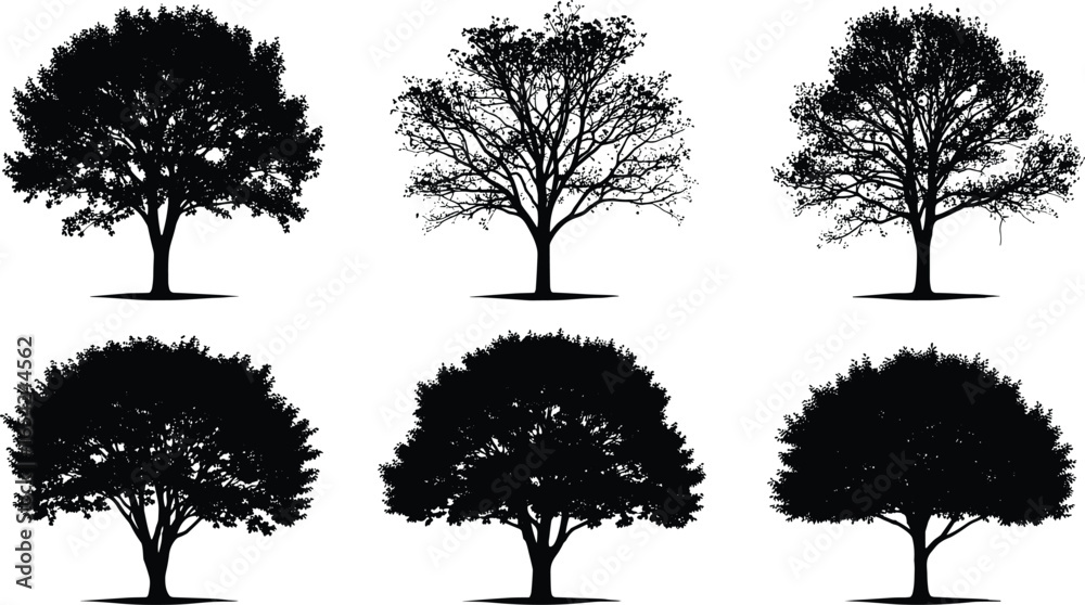 Poster adhésif Silhouettes of six mature oak trees, detailed branches and leaves, nature, fores