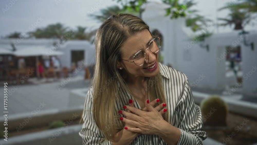 Poster adhésif Middleaged blonde woman with glasses holding hands over chest on urban street; sincerity gratitude warmth