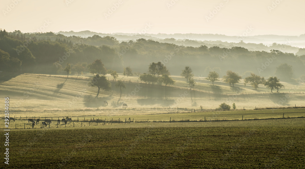 Poster adhésif Landschaft Lothringen Streuobstwiesen und Viehweiden im Morgennebel