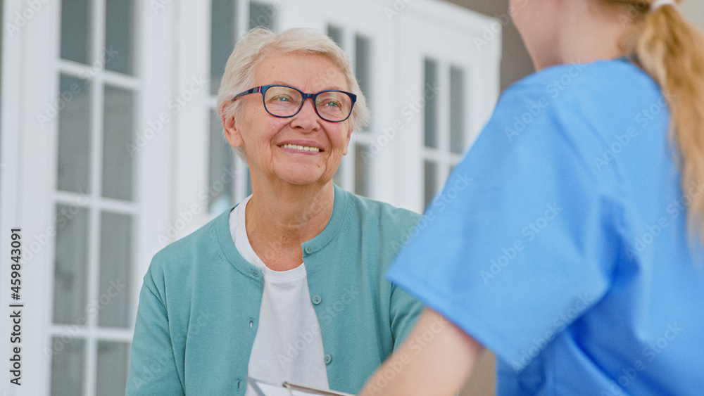 Poster adhésif Positive senior lady nods head listening to caregiver recommendations in light o