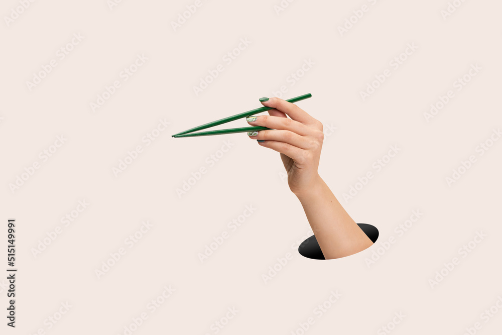 Poster adhésif Female hand holding green chopsticks on clean pink background