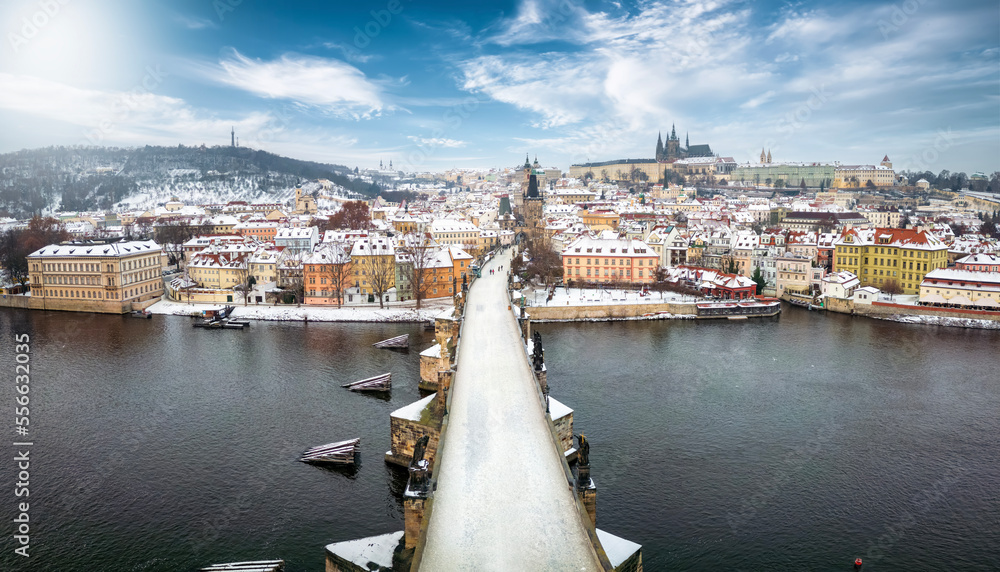 Poster adhésif Panoramic winter view over the famous Charles Bridge in Prague, Czech Republic,