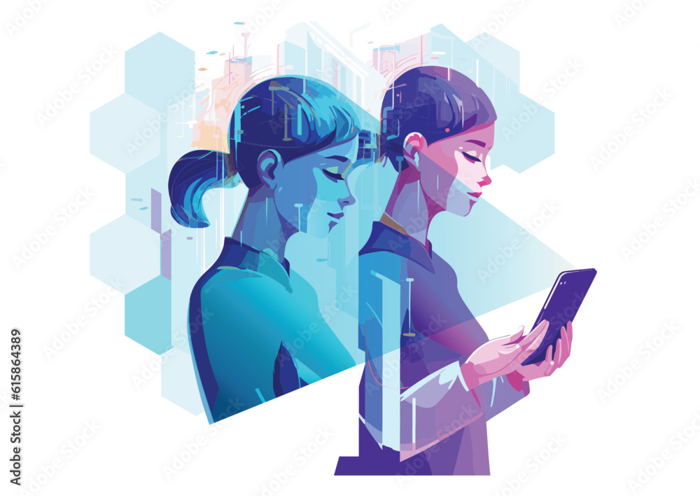 Poster adhésif Digital Twin in metaverse, woman's Avatar connected with digital alter ego in cyberspace concept