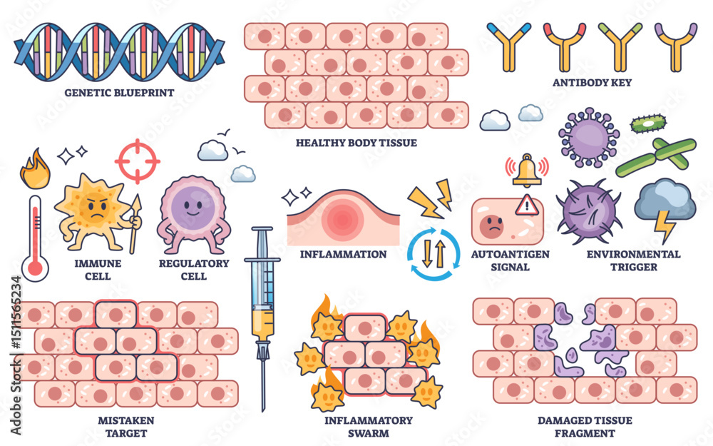 Tableau sur toile Autoimmune diseases are illustrated with immune cells, inflammation, and damaged tissue, highlighting immune system dysfunction, transparent background