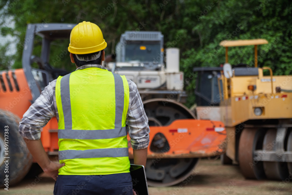 Tableau sur toile Back view of construction workers watching an excavator operate at a busy worksite, capturing teamwork, machinery, and industrial atmosphere