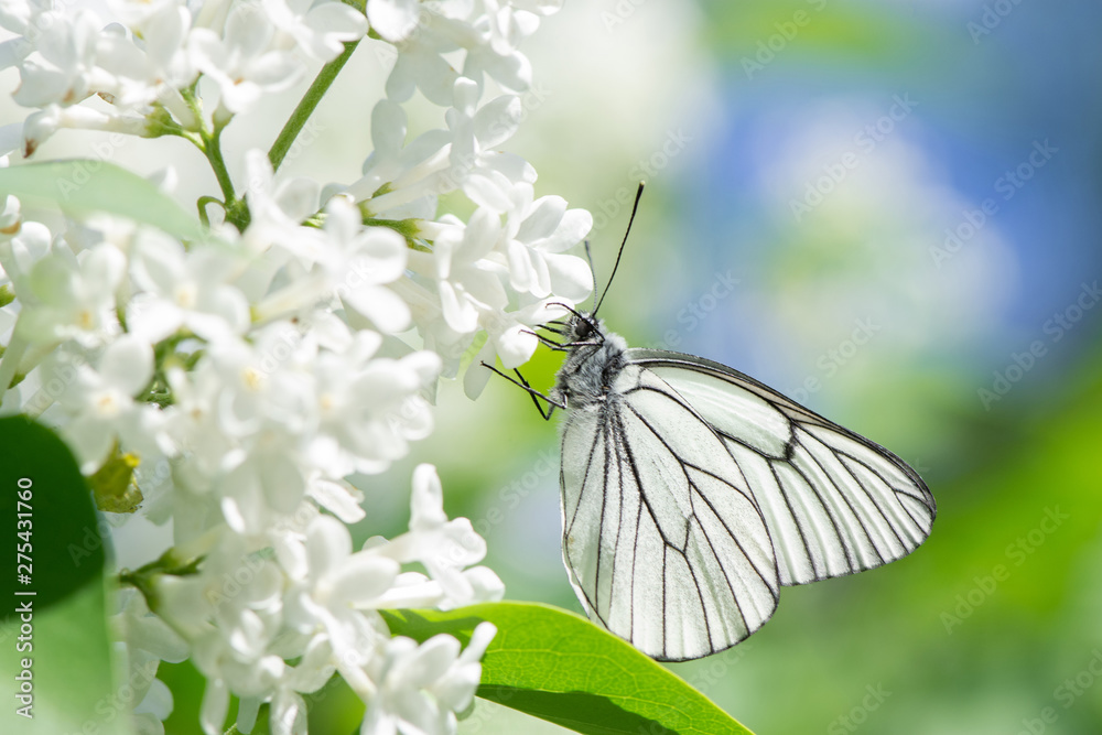 Tableau sur toile Beautiful butterfly Aporia crataegi closeup collects nectar from a bush of lilac