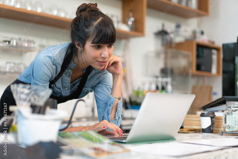 Photos Beautiful female barista owner in apron checking online order from customer on computer tablet at coffee