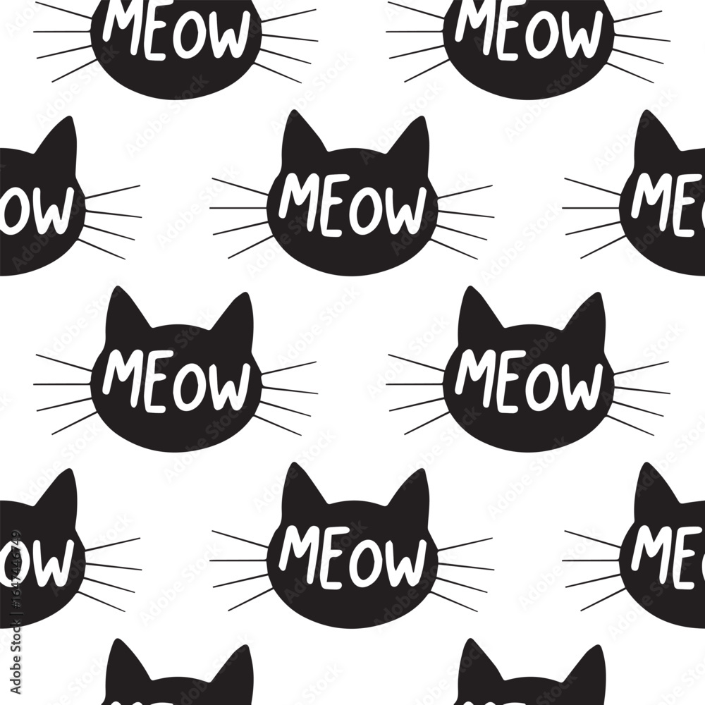 Photos black cat silhouette pattern with meow lettering playful seamless vector backgro