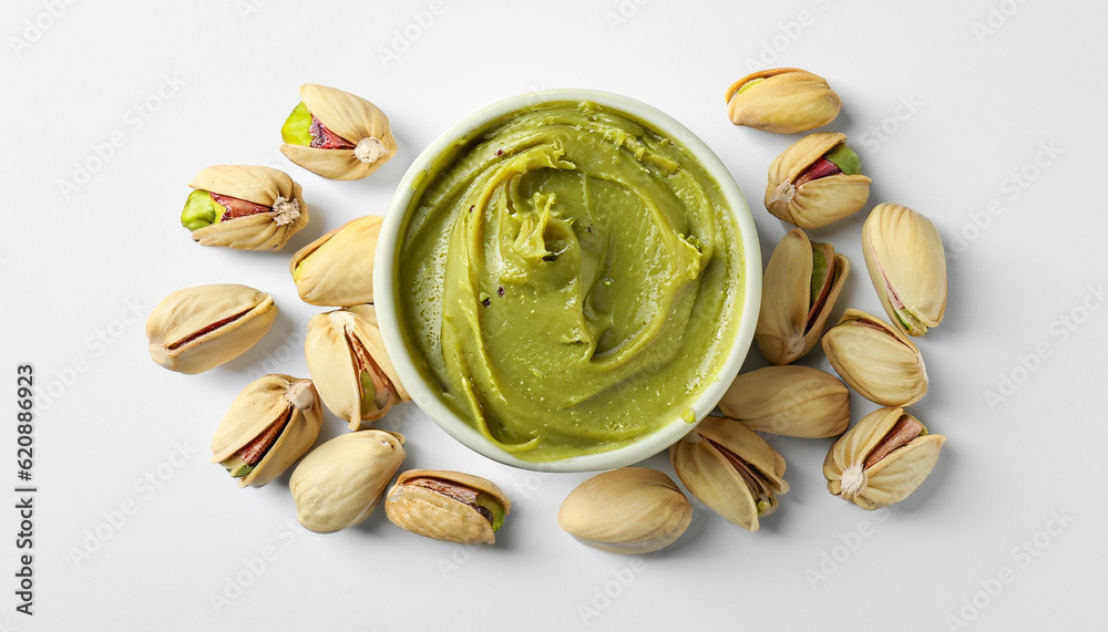 Tableau sur toile Bowl of creamy pistachio butter and nuts on white background, top view