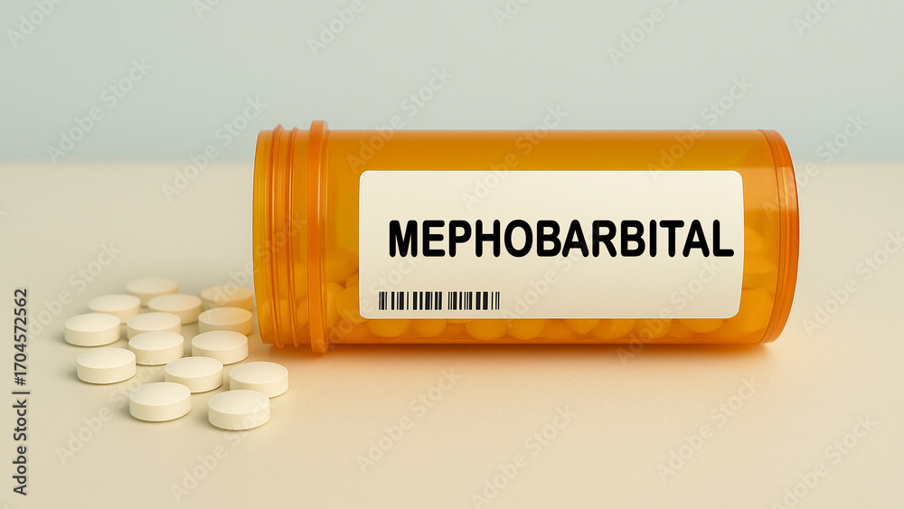 Tableau sur toile Box of MEPHOBARBITAL tablets on a hospital pharmacy table used to treat seizures and anxiety a barbiturate
