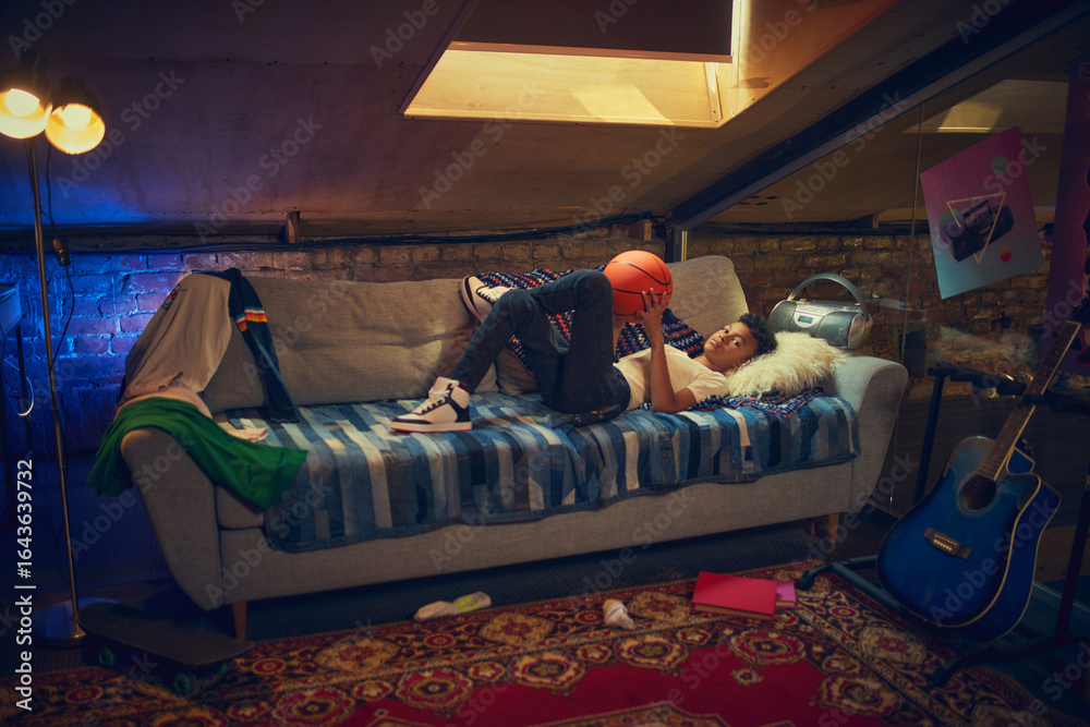 Tableau sur toile Boy relaxing on sofa with basketball in retro attic room