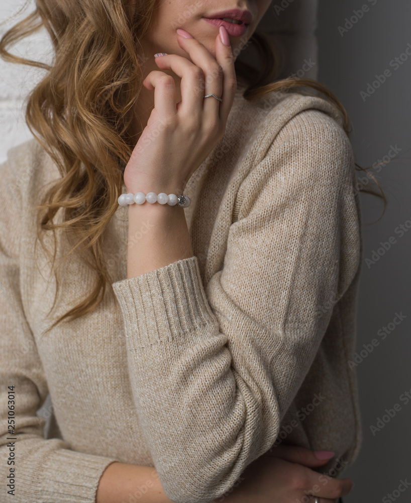 Photos bracelet made of moonstoneis on the hand, on the arm is a bracelet made of white stones