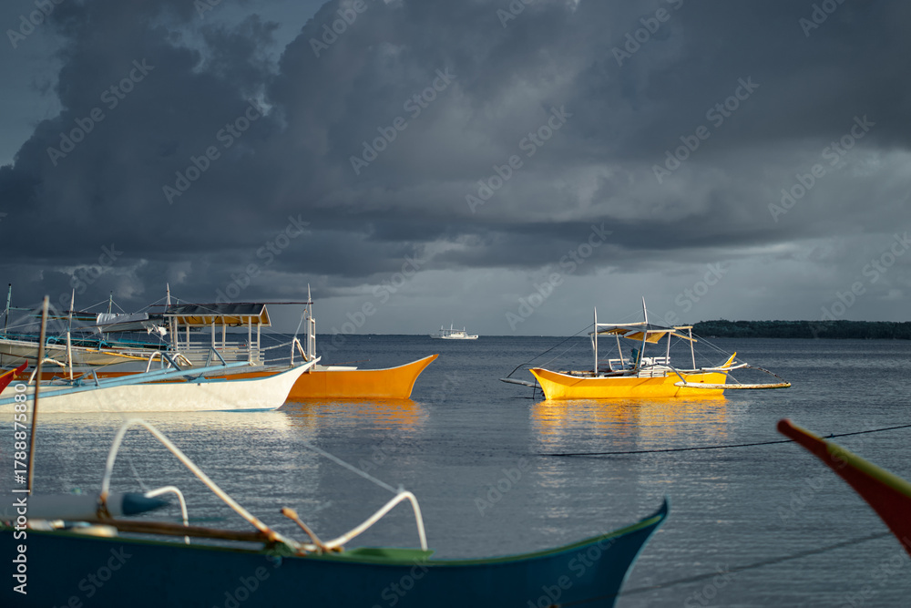 Tableau sur toile Bright yellow boats float on a tranquil sea beneath a moody, cloud-filled sky