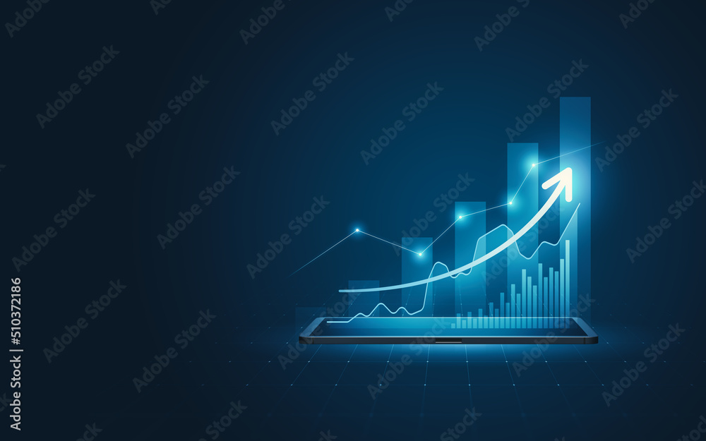 Photos Business 3d tablet virtual growth arrow financial graph on digital technology strategy background with finance data marketing chart analysis report or success investment diagram economy screen profit