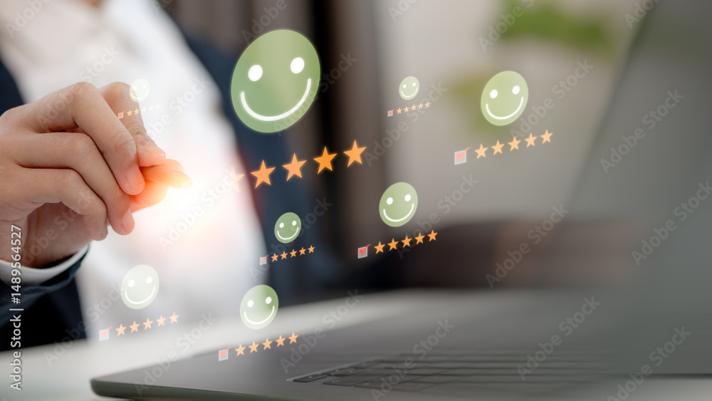 Tableau sur toile Businessman hand pointing to five star rating and smiley face icon on virtual screen